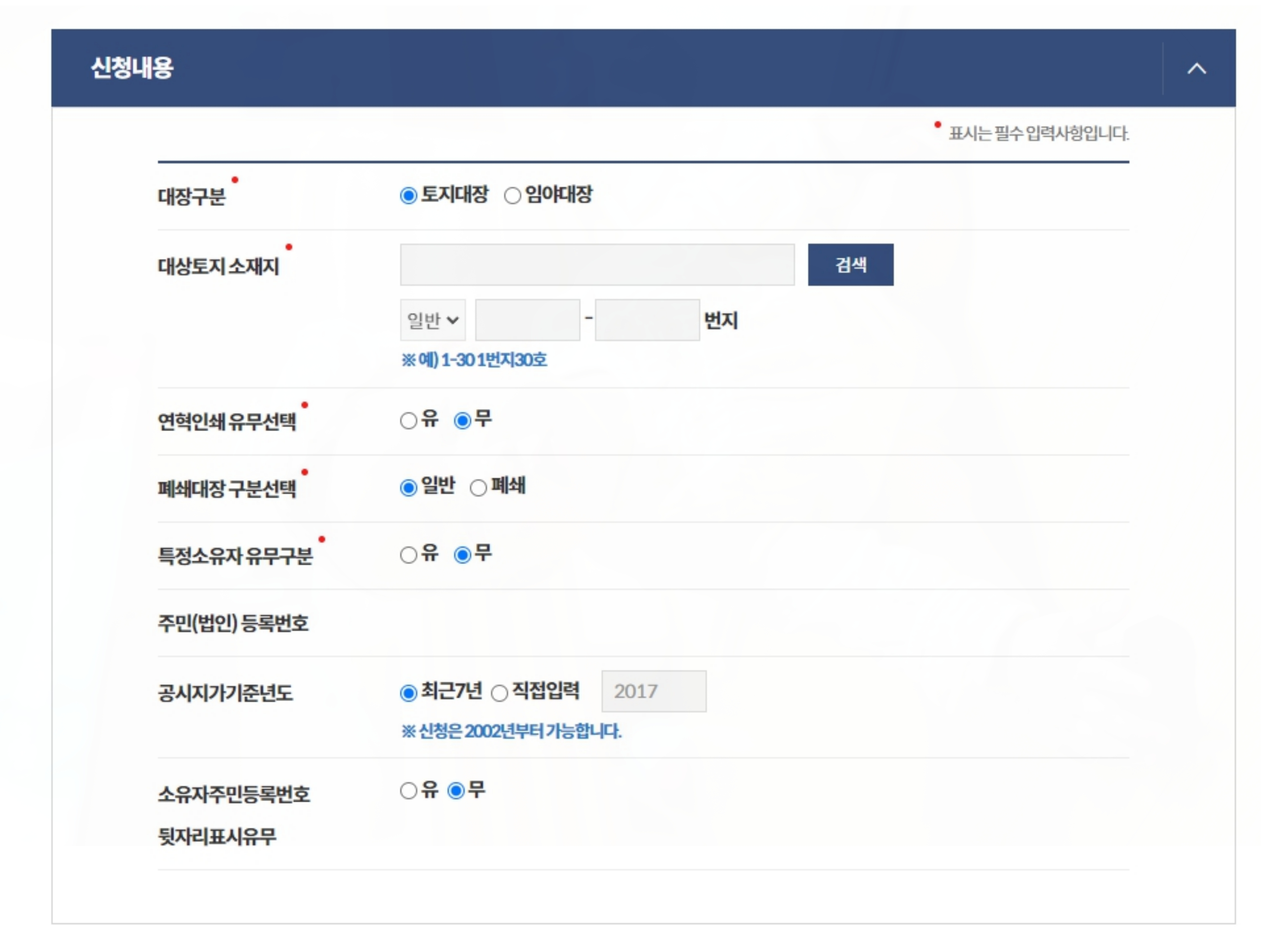 알고 싶은 대상 토지의 소재지를 적은 후 아래 연혁인쇄유무선택 및 빨간색 표시의 필수 입력 사항을 모두 입력하시면 됩니다.